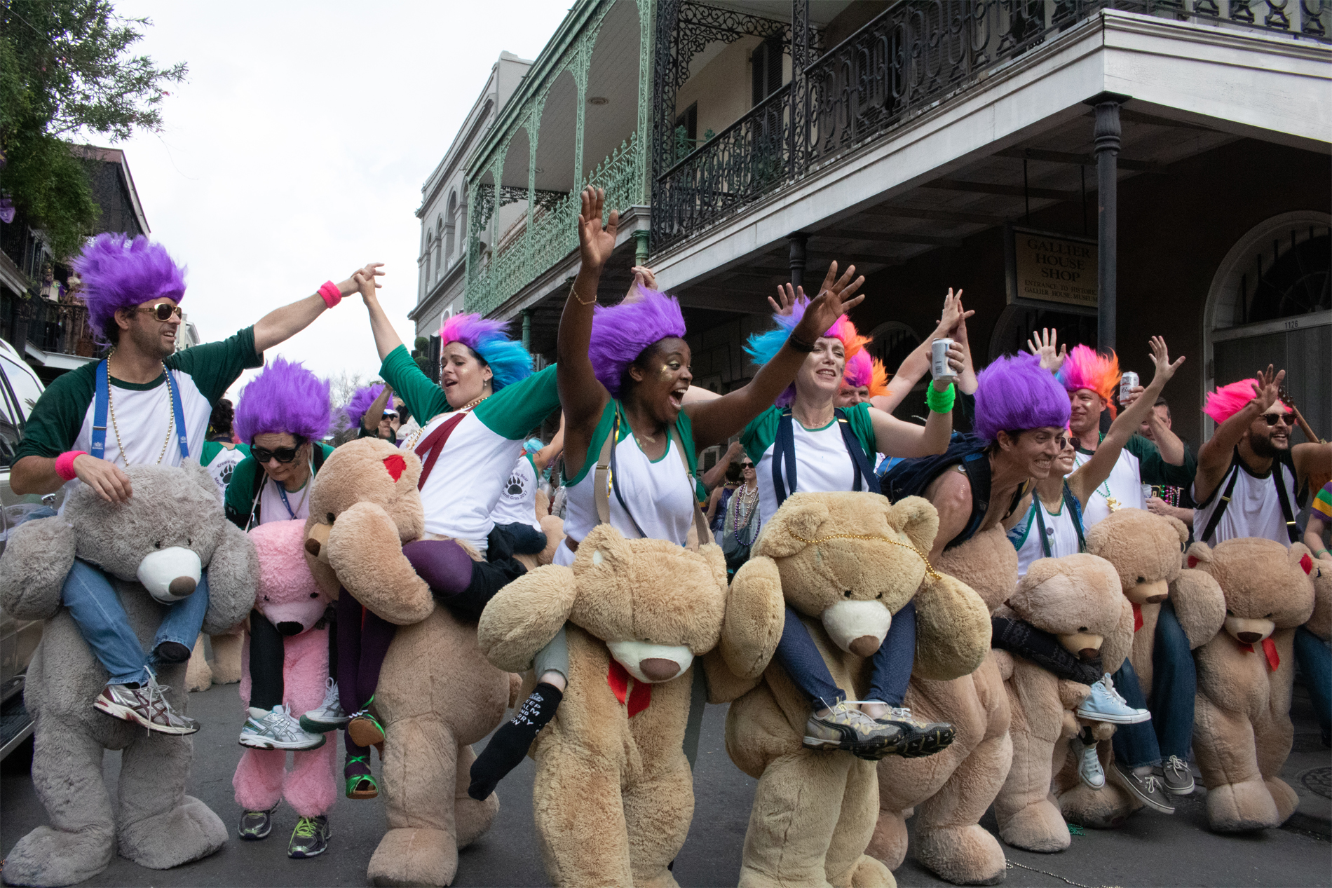 For many New Orleanians the Mardi Gras celebration begins by gathering with friends of the Secret Society of Saint Anne, followed by parading through the French Quarter with the Storyville Stompers Band et al, stopping at Canal Street to watch the Rex Parade then strutting, prancing and dancing back into the quarter culminating at the Moonwalk with some members throwing ashes of their beloveds into the Mississippi River.