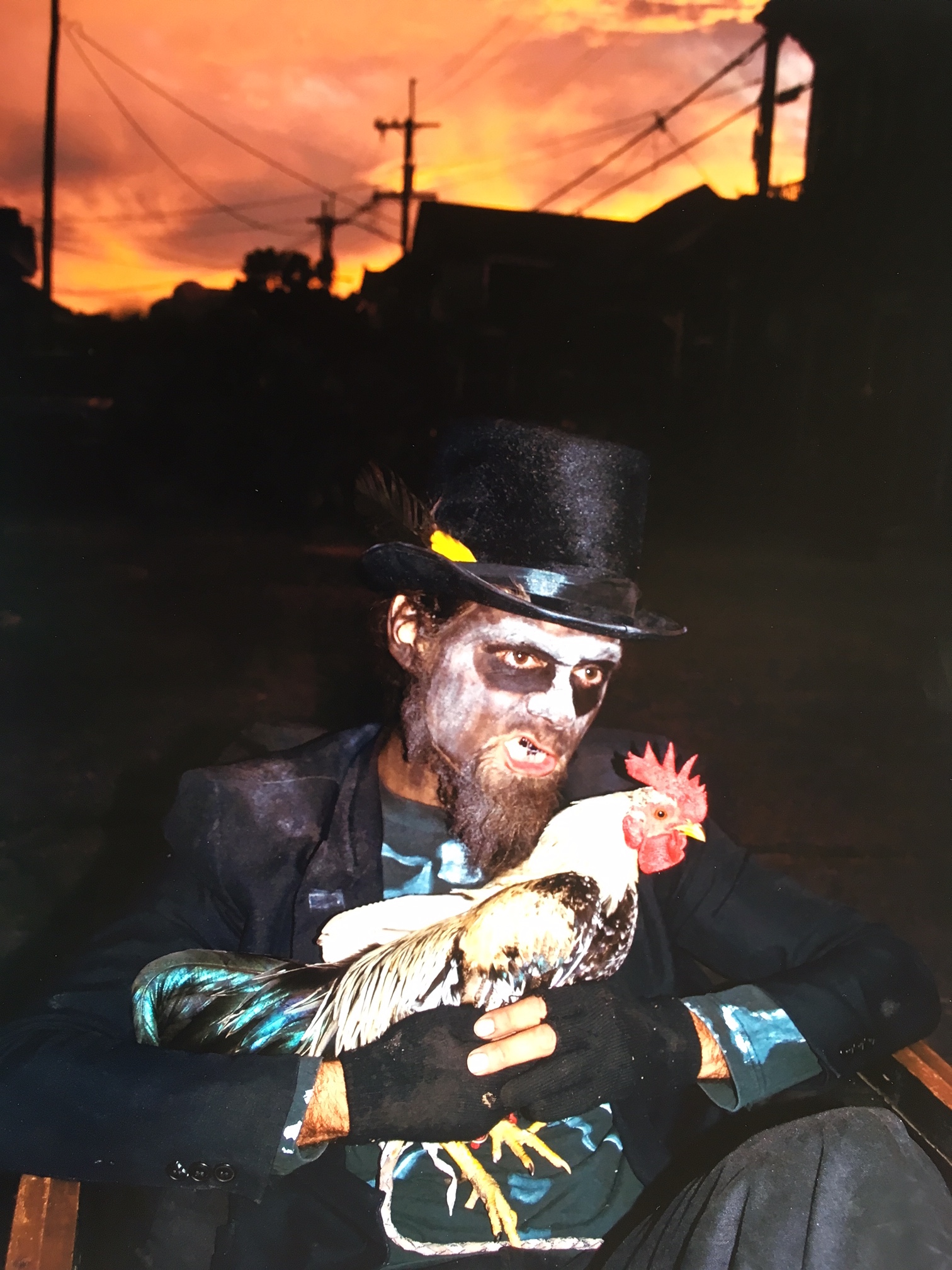 This photo was taken at the 6t'9 Social Aid & Pleasure Club Halloween Parade in Treme during one of the most amazing sunsets I have ever seen in New Orleans. It was an ethereal experience being enveloped in such intense colors both in the stunning sky and the passing joyful energy sheathed in inventive fascinating costumes. In order to capture a close up, what is not seen is that the skelly man is peddling a coffin. As is frequently said, Only in New Orleans!!!